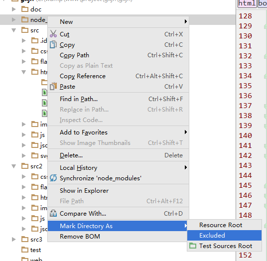 文件包多了,webStorm 卡顿,请按照下面的操作把文件夹给excluded (排除)掉